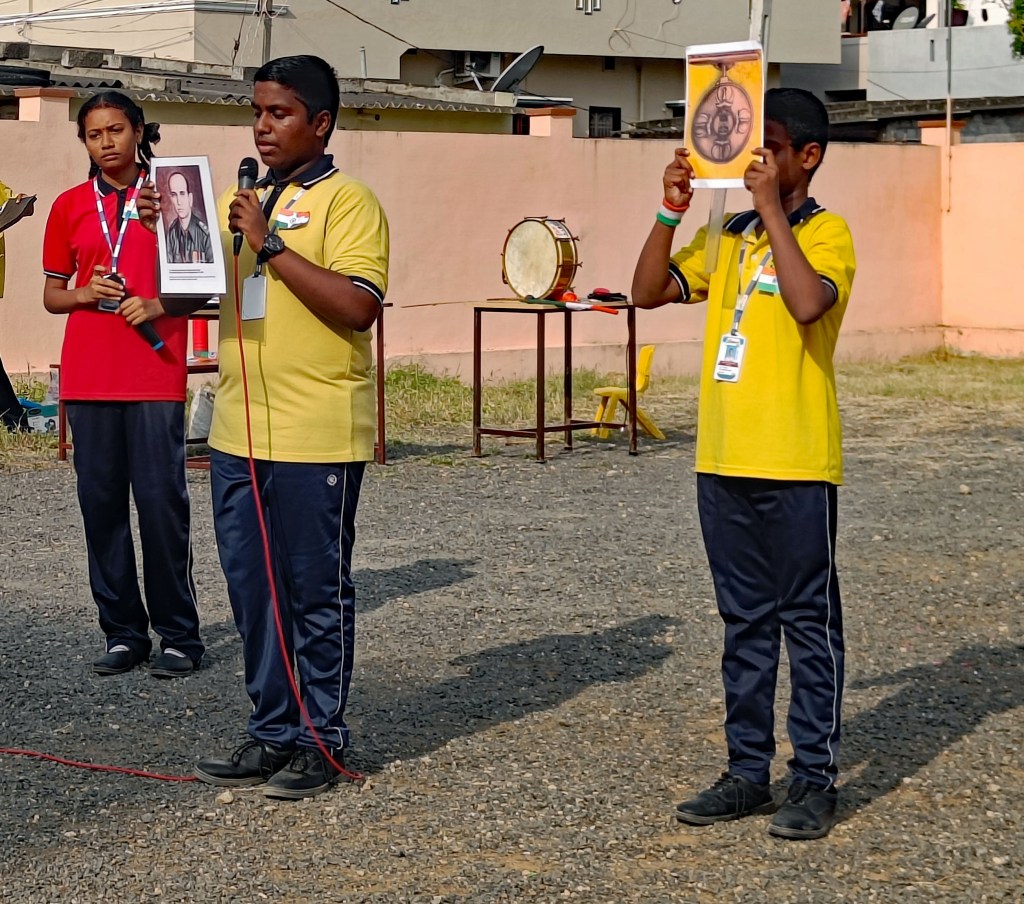 The programme ended with a vote of thanks: the social teacher Laxmi Kumari mam was lauded for her valuable contribution in organizing a presentation our brave hearts, the Param Vir Chakra recipients; Srujana mam and Elizabeth mam were appreciated for their tireless efforts at song rehearsals. Throughout the event, Aashritha and Saranya from class 10 skilfully anchored.
